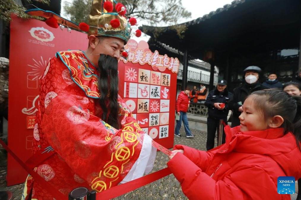 A staff member dressed as a "God of Wealth" interacts with a girl at Heyuan scenic area in Yangzhou City, east China's Jiangsu Province, Feb. 2, 2025. Folk events were held across the country on Sunday to receive the "Gods of Wealth," a tradition to celebrate the fifth day of the Chinese New Year, or the Spring Festival. (Photo by Meng Delong/Xinhua)