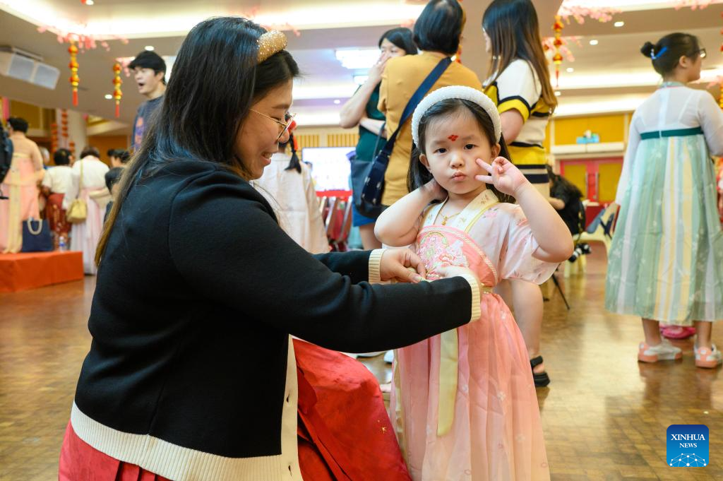 A young girl in Hanfu attire poses for photos in Kuala Lumpur, Malaysia, Feb. 2, 2025. A Hanfu-themed gathering in celebration of the Chinese Lunar New Year, or the Spring Festival, was held here on Sunday. (Photo by Chong Voon Chung/Xinhua)