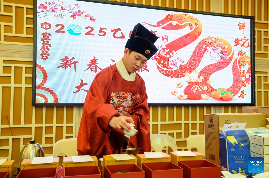 A man performs tea art during a Hanfu-themed gathering in Kuala Lumpur, Malaysia, Feb. 2, 2025. A Hanfu-themed gathering in celebration of the Chinese Lunar New Year, or the Spring Festival, was held here on Sunday. (Photo by Chong Voon Chung/Xinhua)