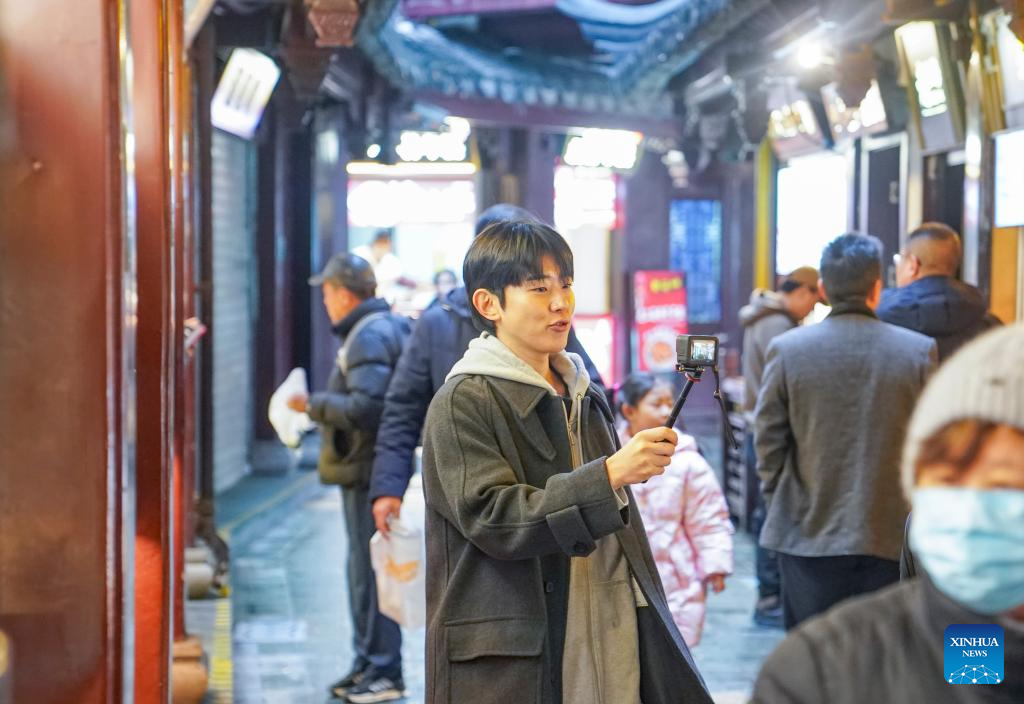 South Korean tourist Taeyeol Kim records vlog at the Yuyuan Garden area in east China's Shanghai, Feb. 1, 2025. As the Chinese people are celebrating the Spring Festival, or the Chinese New Year, they have been joined this year by an increased number of foreign tourists, who have come to experience Chinese culture following the implementation of a new visa-free transit policy. (Photo by Chen Haoming/Xinhua)
