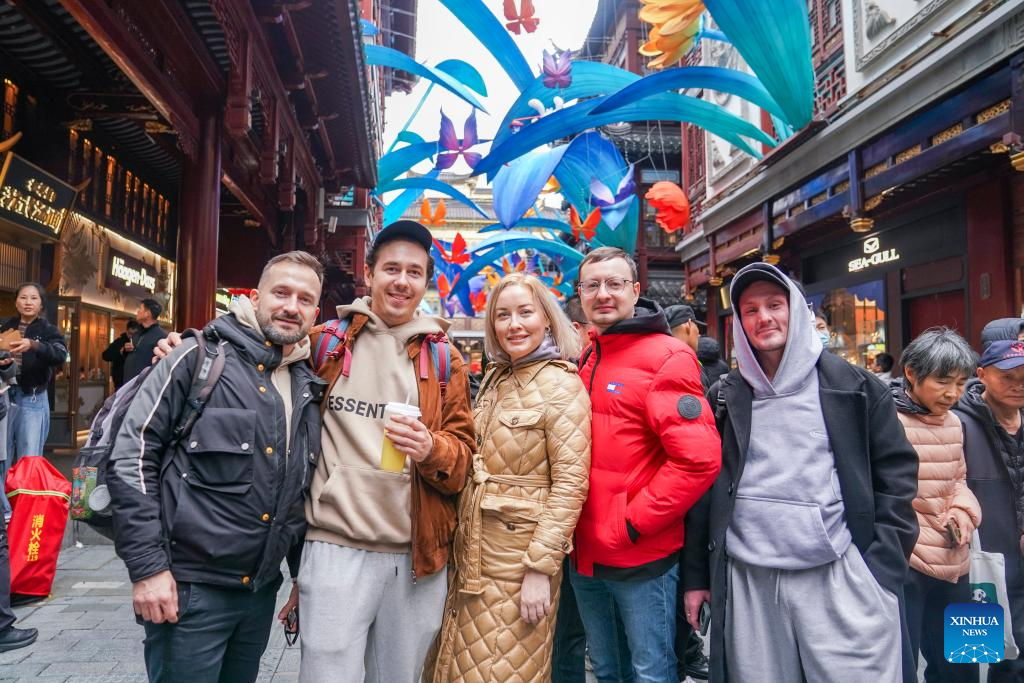 Tourists from Belarus and Russia pose for photos at the Yuyuan Garden area in east China's Shanghai, Feb. 1, 2025. As the Chinese people are celebrating the Spring Festival, or the Chinese New Year, they have been joined this year by an increased number of foreign tourists, who have come to experience Chinese culture following the implementation of a new visa-free transit policy.