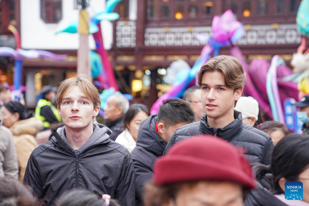 French tourists Paul Baisse (L) and Jules Ramos visit Yuyuan Garden area in east China's Shanghai, Feb. 1, 2025. As the Chinese people are celebrating the Spring Festival, or the Chinese New Year, they have been joined this year by an increased number of foreign tourists, who have come to experience Chinese culture following the implementation of a new visa-free transit policy. (Photo by Chen Haoming/Xinhua)
