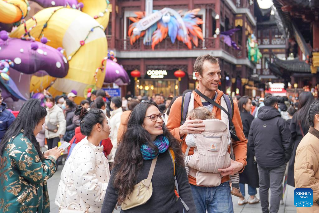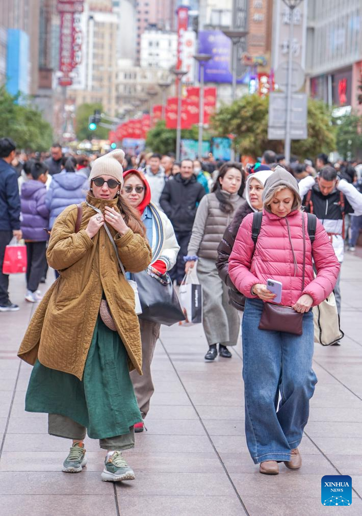 Foreign tourists are pictured at the Nanjing Road pedestrian walkway in Shanghai, east China, Feb. 1, 2025. As the Chinese people are celebrating the Spring Festival, or the Chinese New Year, they have been joined this year by an increased number of foreign tourists, who have come to experience Chinese culture following the implementation of a new visa-free transit policy. (Photo by Chen Haoming/Xinhua)
