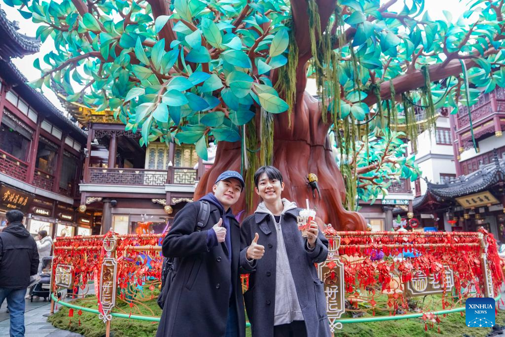 Tourists Junghoo Shim (L) and Taeyeol Kim from South Korea pose for photos with a cup of bubble tea at the Yuyuan Garden area in east China's Shanghai, Feb. 1, 2025. As the Chinese people are celebrating the Spring Festival, or the Chinese New Year, they have been joined this year by an increased number of foreign tourists, who have come to experience Chinese culture following the implementation of a new visa-free transit policy. (Photo by Chen Haoming/Xinhua)