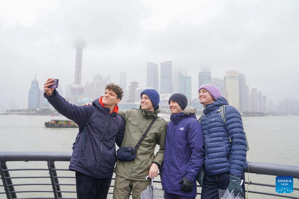 Tourists from France and Bulgaria pose for selfies at the Bund area in east China's Shanghai, Feb. 1, 2025. As the Chinese people are celebrating the Spring Festival, or the Chinese New Year, they have been joined this year by an increased number of foreign tourists, who have come to experience Chinese culture following the implementation of a new visa-free transit policy. (Photo by Chen Haoming/Xinhua)