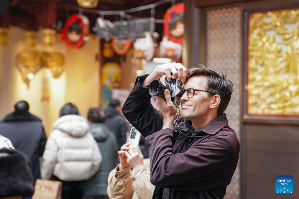 Canadian tourist Johnathan Alexiuk takes photos at the Yuyuan Garden area in east China's Shanghai, Feb. 1, 2025. As the Chinese people are celebrating the Spring Festival, or the Chinese New Year, they have been joined this year by an increased number of foreign tourists, who have come to experience Chinese culture following the implementation of a new visa-free transit policy. (Photo by Chen Haoming/Xinhua)