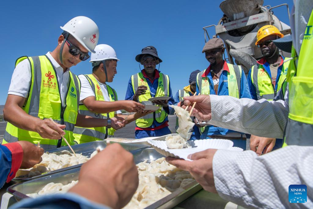 Staff members from China and Namibia enjoy dumplings at the Phase 2B project of a freeway connecting Windhoek, the Namibian capital, to Hosea Kutako International Airport to the east of Windhoek, in Namibia, Feb. 1, 2025. Chinese workers and their local counterparts with Zhong Mei Engineering Group, the Chinese company that had contracted to construct the Phase 2B project of a freeway connecting Windhoek, the Namibian capital, to Hosea Kutako International Airport to the east of Windhoek, on Saturday celebrated the Chinese Spring Festival with style.