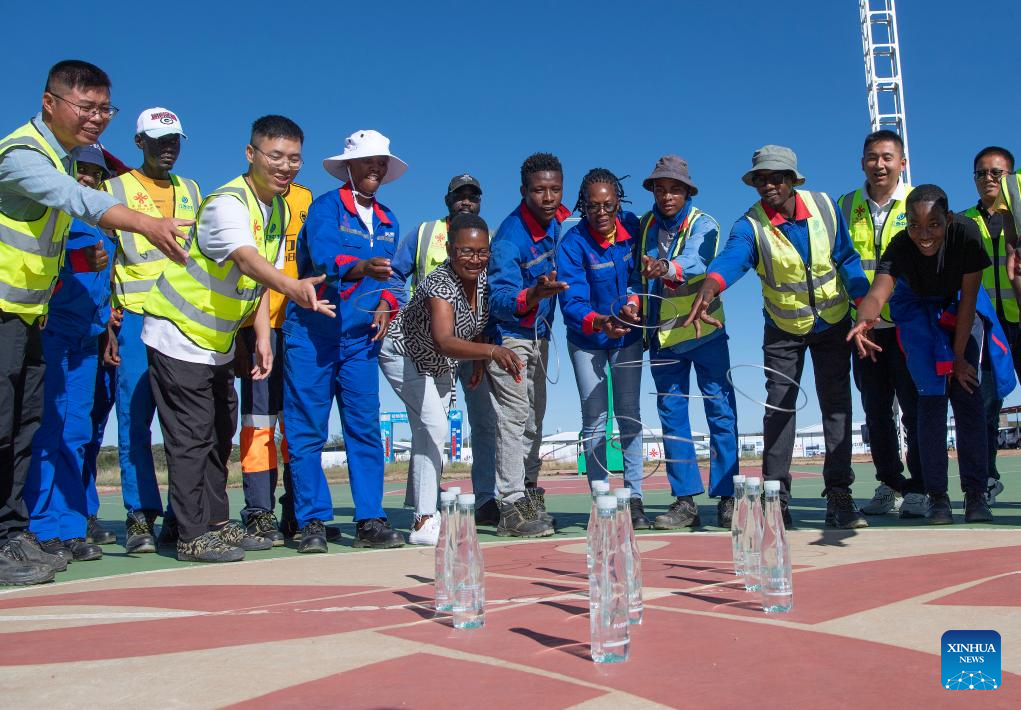 Staff members from China and Namibia play a ring toss game at the site of the Phase 2B project of a freeway connecting Windhoek, the Namibian capital, to Hosea Kutako International Airport to the east of Windhoek, in Namibia, Feb. 1, 2025. Chinese workers and their local counterparts with Zhong Mei Engineering Group, the Chinese company that had contracted to construct the Phase 2B project of a freeway connecting Windhoek, the Namibian capital, to Hosea Kutako International Airport to the east of Windhoek, on Saturday celebrated the Chinese Spring Festival with style.