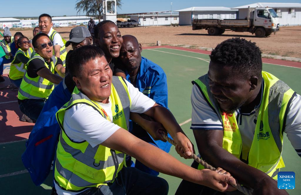 Staff members from China and Namibia play a tug-of-war game at the site of the Phase 2B project of a freeway connecting Windhoek, the Namibian capital, to Hosea Kutako International Airport to the east of Windhoek, in Namibia, Feb. 1, 2025. Chinese workers and their local counterparts with Zhong Mei Engineering Group, the Chinese company that had contracted to construct the Phase 2B project of a freeway connecting Windhoek, the Namibian capital, to Hosea Kutako International Airport to the east of Windhoek, on Saturday celebrated the Chinese Spring Festival with style.