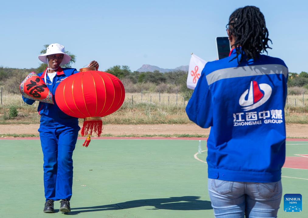 A Namibian staff member holding a lantern poses for photos at the site of the Phase 2B project of a freeway connecting Windhoek, the Namibian capital, to Hosea Kutako International Airport to the east of Windhoek, in Namibia, Feb. 1, 2025. Chinese workers and their local counterparts with Zhong Mei Engineering Group, the Chinese company that had contracted to construct the Phase 2B project of a freeway connecting Windhoek, the Namibian capital, to Hosea Kutako International Airport to the east of Windhoek, on Saturday celebrated the Chinese Spring Festival with style.