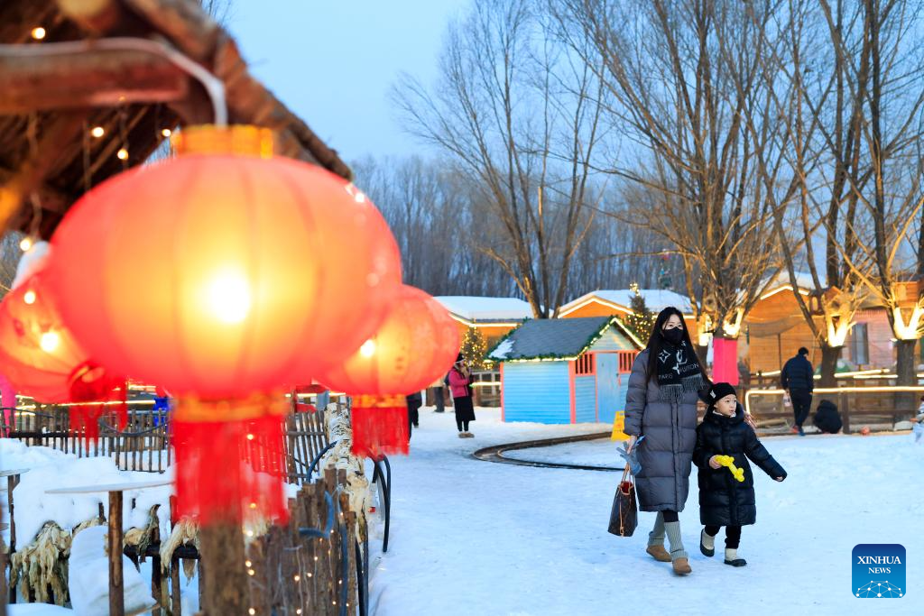 People visit a snow town scenic spot in Zunhua City, north China's Hebei Province, Feb. 4, 2025. During the Spring Festival holiday, many tourist destinations in China have attracted visitors with ice and snow activities. (Photo by Liu Mancang/Xinhua)