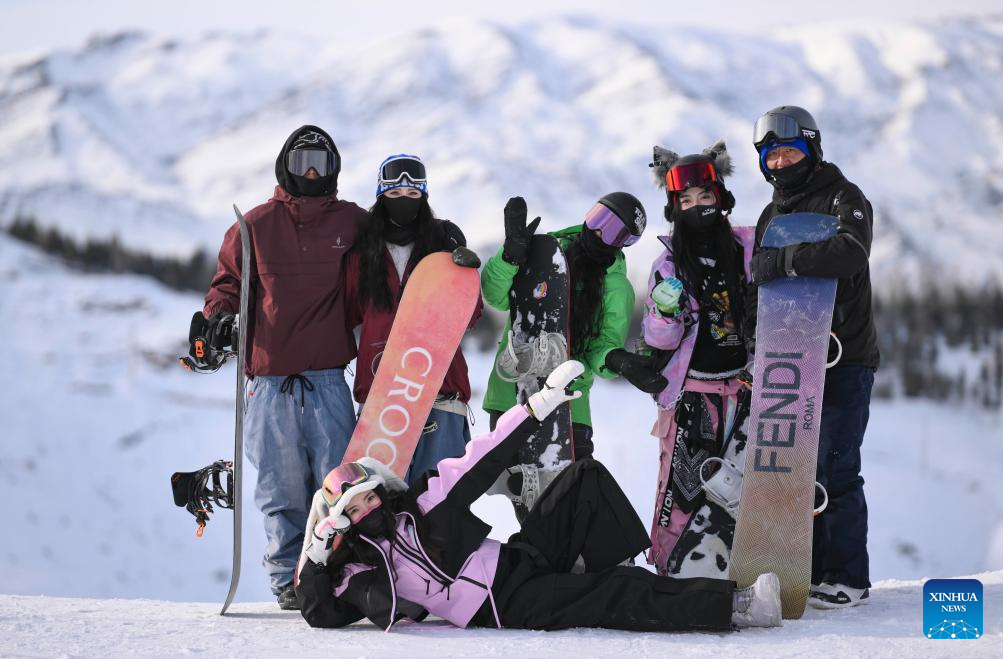 Skiers pose for a group photo at Jiangjunshan International Ski Resort in Altay, northwest China's Xinjiang Uygur Autonomous Region, Jan. 28, 2025. During the Spring Festival holiday, many tourist destinations in China have attracted visitors with ice and snow activities. (Xinhua/Hu Huhu)