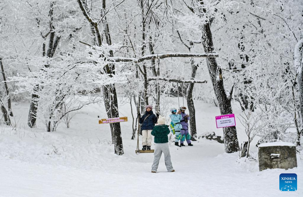 People visit a scenic spot in Tangshan, north China's Hebei Province, Jan. 29, 2025. During the Spring Festival holiday, many tourist destinations in China have attracted visitors with ice and snow activities. (Photo by Li Xiuqing/Xinhua)