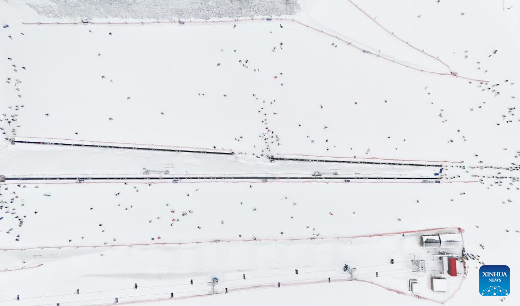 An aerial drone photo taken on Jan. 31, 2025 shows people skiing at Qiangrengu ski resort in Wenchuan County, Aba Tibetan and Qiang Autonomous Prefecture, southwest China's Sichuan Province. During the Spring Festival holiday, many tourist destinations in China have attracted visitors with ice and snow activities. (Xinhua/Liu Kun)