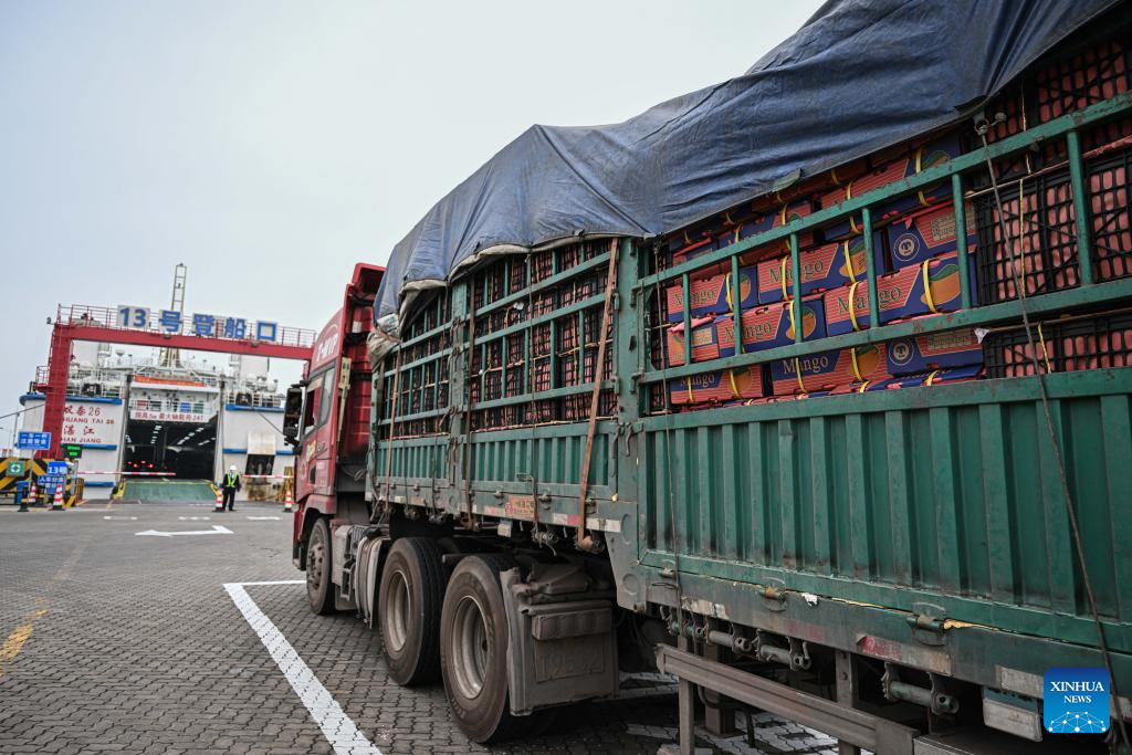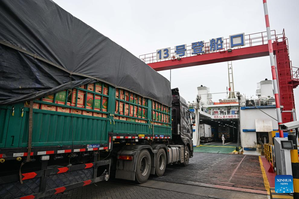 A truck loaded with fresh agricultural products boards a ship at Xinhai Port in Haikou, south China's Hainan Province, Feb. 3, 2025. Qiongzhou Strait has ushered in a travel peak for returning during the Spring Festival travel rush. To ensure the efficient transportation of fresh agricultural products, Xinhai Port and Xiuying Port in Haikou have implemented a reservation system for smooth boarding of transportation vehicles. Drivers can have their tickets purchased and checked without getting off their vehicles. (Xinhua/Pu Xiaoxu)