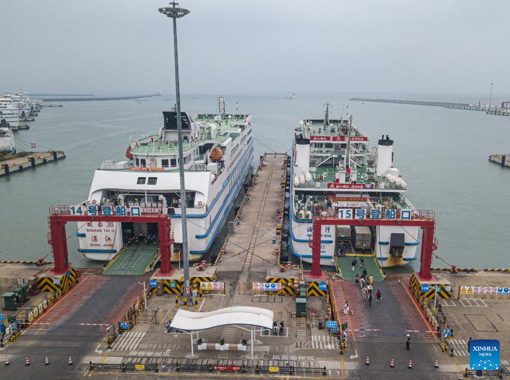 An aerial drone photo taken on Feb. 3, 2025 shows vehicles and passengers boarding ships at Xinhai Port in Haikou, south China's Hainan Province. Qiongzhou Strait has ushered in a travel peak for returning during the Spring Festival travel rush. To ensure the efficient transportation of fresh agricultural products, Xinhai Port and Xiuying Port in Haikou have implemented a reservation system for smooth boarding of transportation vehicles. Drivers can have their tickets purchased and checked without getting off their vehicles. (Xinhua/Pu Xiaoxu)