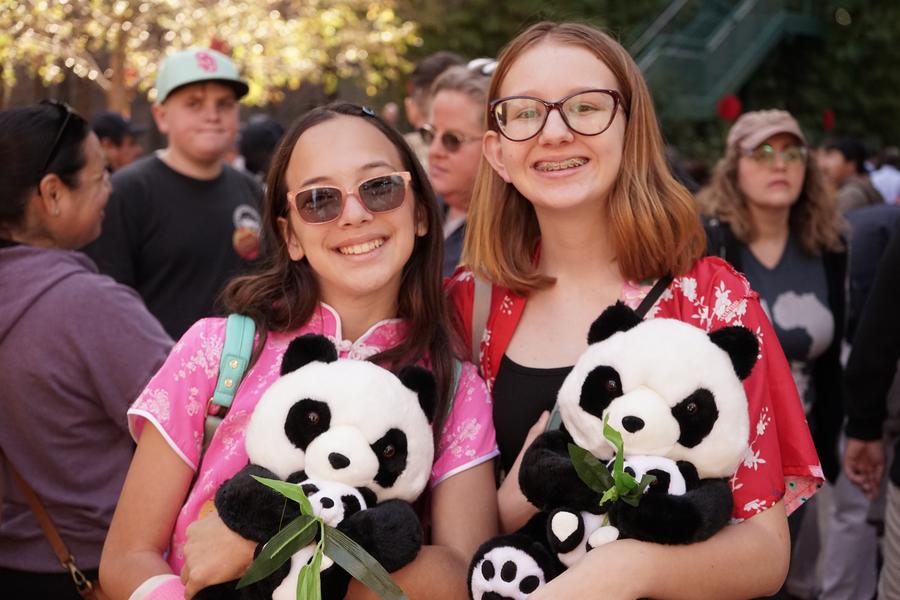 Two girls holding giant panda dolls pose for photos during a Chinese Lunar New Year celebration at the San Diego Zoo in San Diego, California, the United States, on Feb. 2, 2025. (Photo by Zeng Hui/Xinhua)