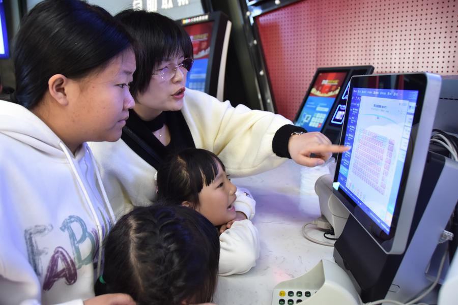 Parents with their children claim tickets at a cinema in Xiqing District, north China's Tianjin, Feb. 3, 2025. (Xinhua/Li Ran)