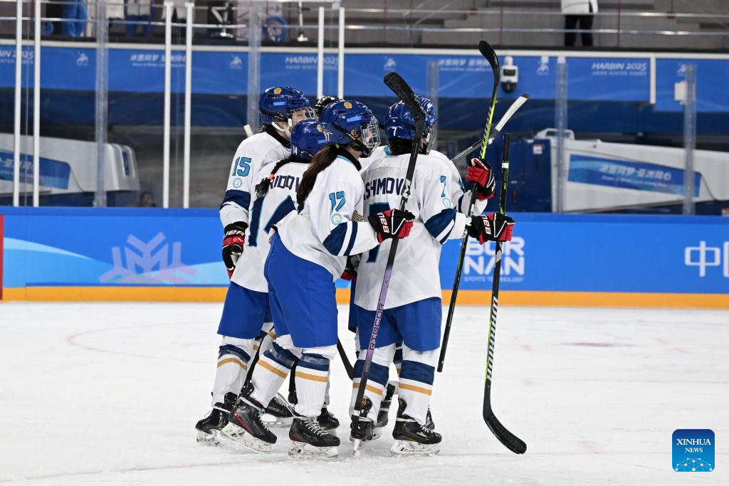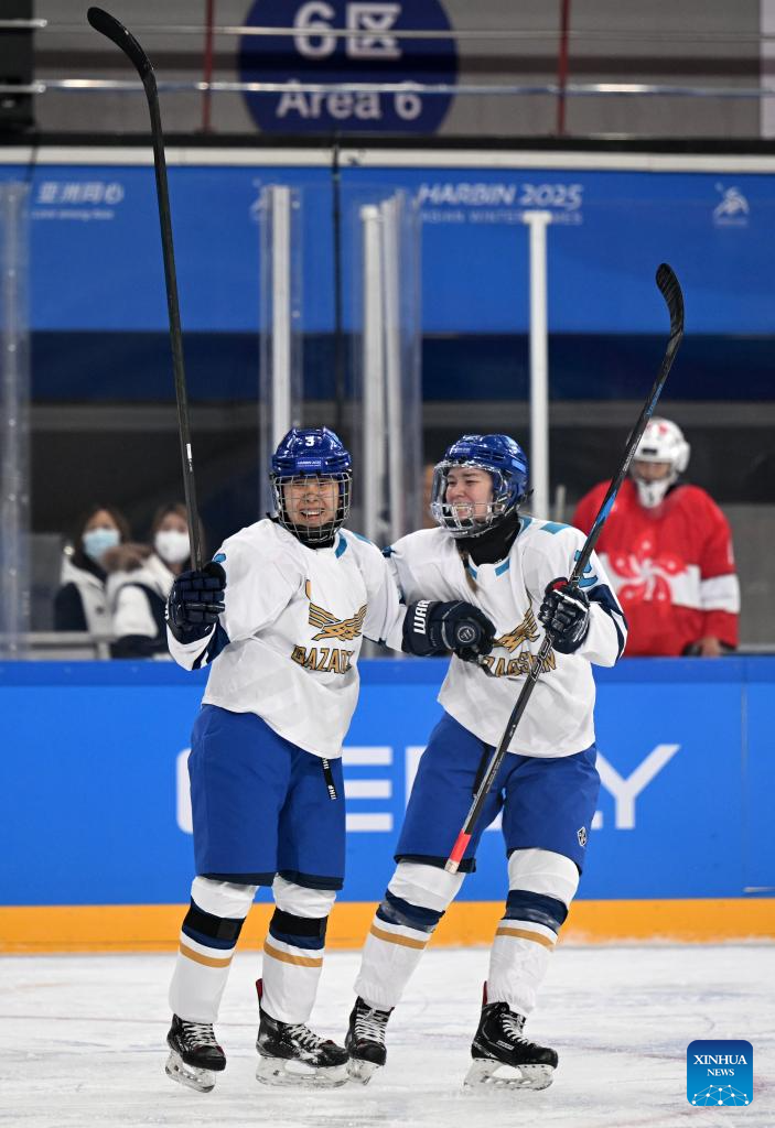 Players of Kazakhstan celebrate scoring during the women's ice hocky group B match between Kazakhstan and China's Hong Kong at 2025 Asian Winter Games in Harbin, northeast China's Heilongjiang Province, on Feb. 3, 2025. (Xinhua/Chen Zhenhai)