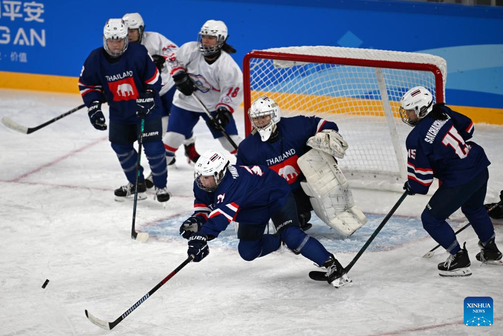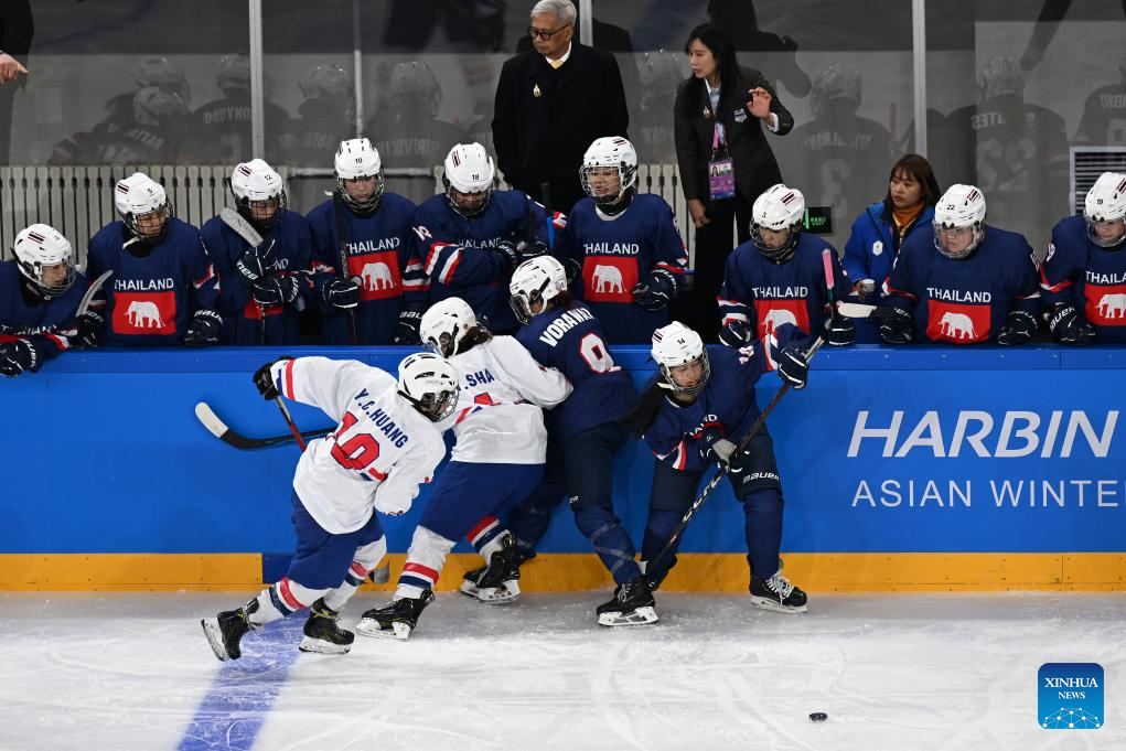 Thipwarintorn Yannakornthanapunt (C) of Thailand competes during the women's ice hocky group B match between Thailand and Chinese Taipei at 2025 Asian Winter Games in Harbin, northeast China's Heilongjiang Province, on Feb. 3, 2025. (Xinhua/Chen Zhenhai)