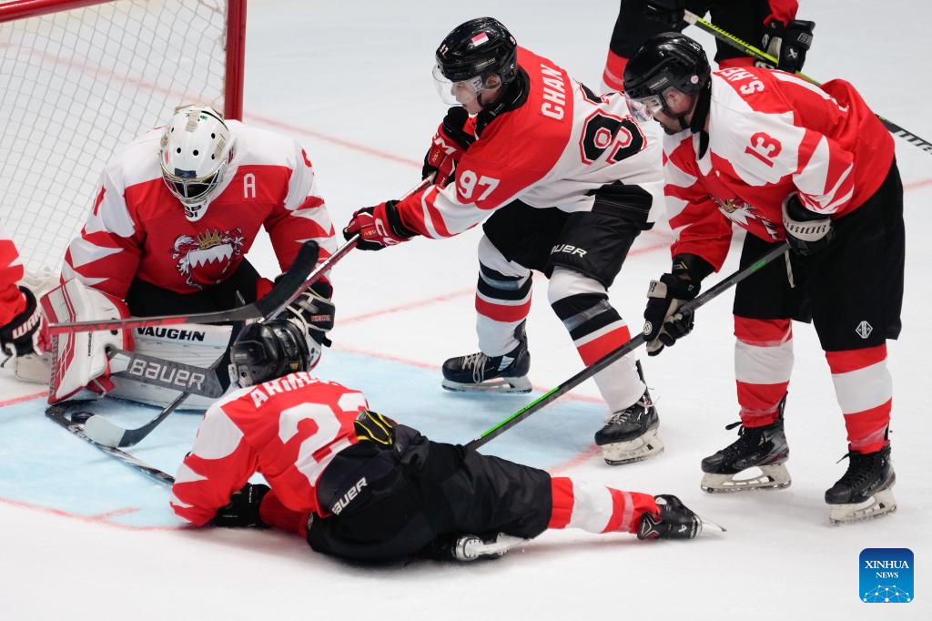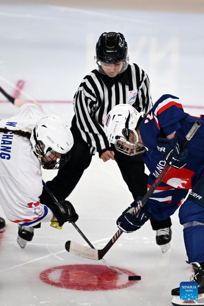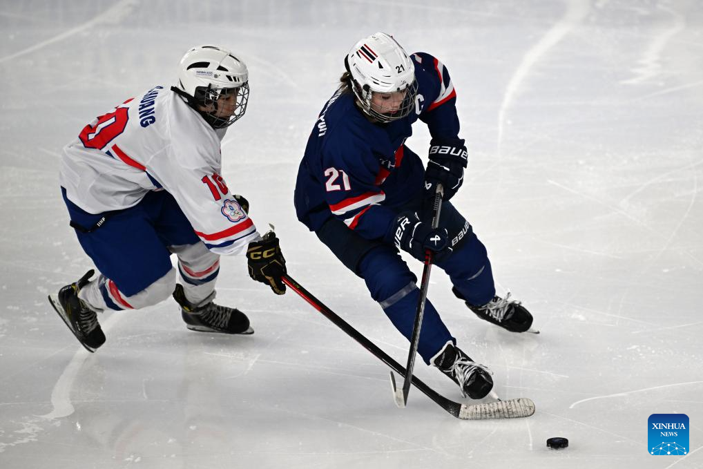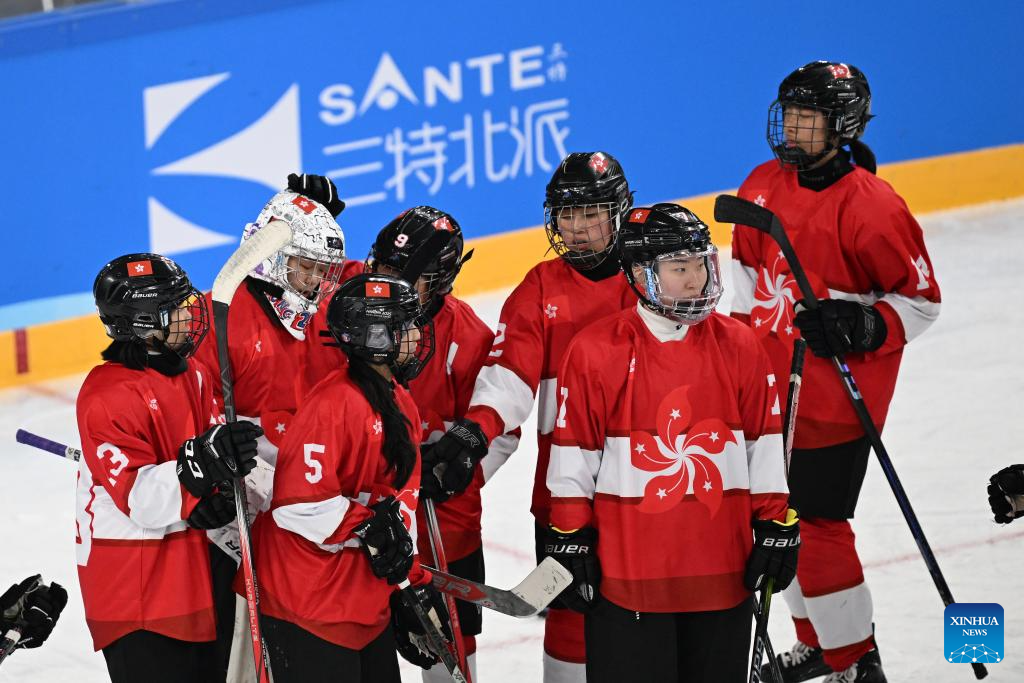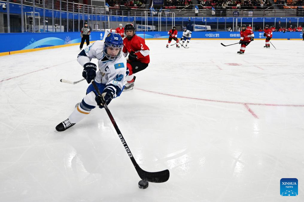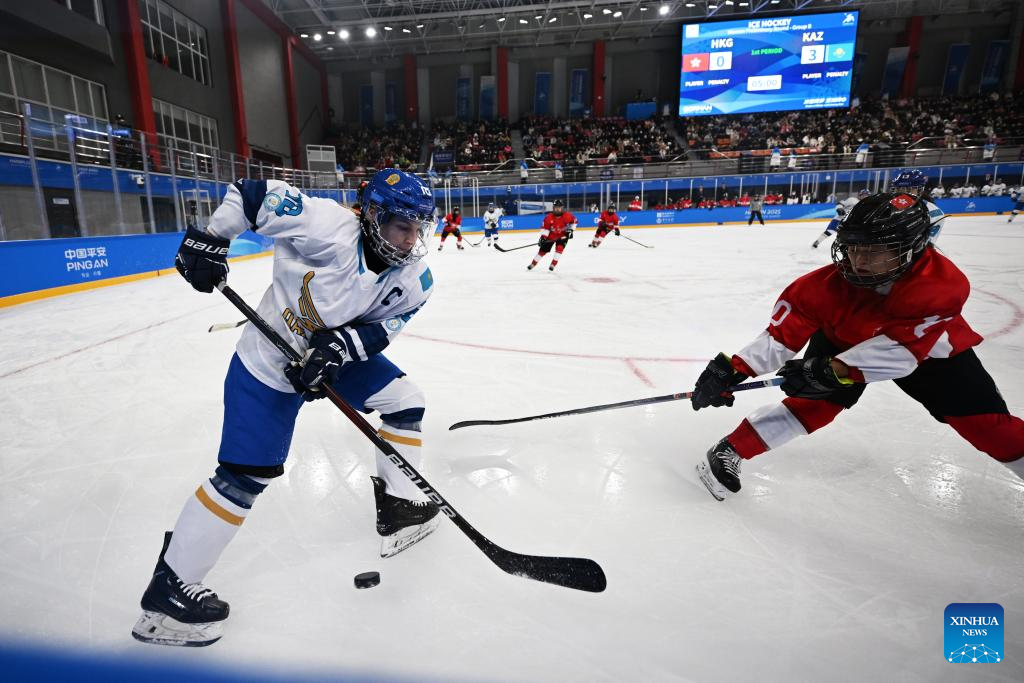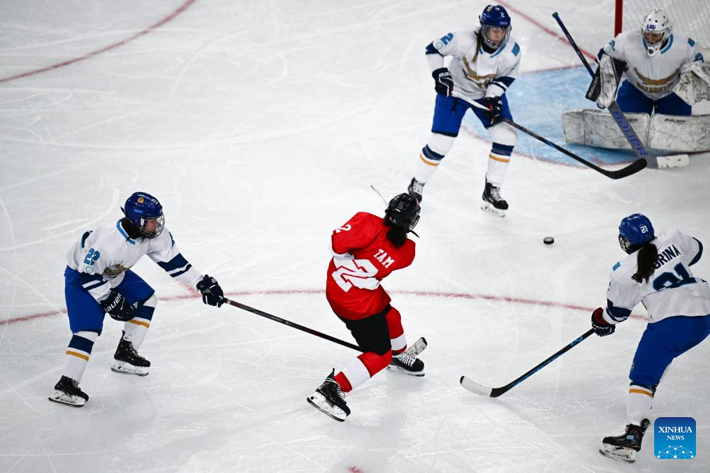 Tam Wing Hei (C) of China's Hong Kong competes during the women's ice hocky group B match between Kazakhstan and China's Hong Kong at 2025 Asian Winter Games in Harbin, northeast China's Heilongjiang Province, on Feb. 3, 2025. (Xinhua/Chen Zhenhai)