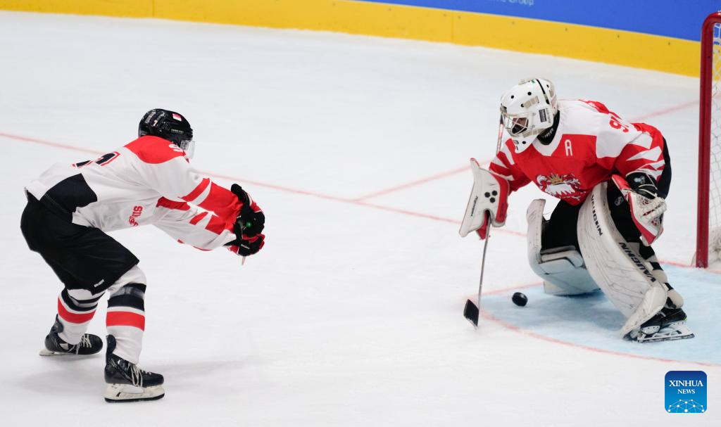 Chan Joshua Yu Wen (R) of Singapore shoots to score during the men's ice hocky group B match between Singapore and Bahrain at 2025 Asian Winter Games in Harbin, northeast China's Heilongjiang Province, on Feb. 3, 2025. (Xinhua/Wang Jianwei)