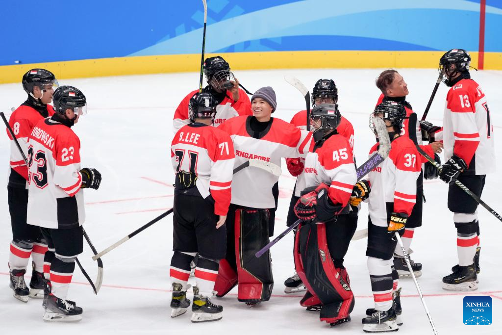 Players of Singapore celebrate after winning the men's ice hocky group B match between Singapore and Bahrain at 2025 Asian Winter Games in Harbin, northeast China's Heilongjiang Province, on Feb. 3, 2025. (Xinhua/Wang Jianwei)