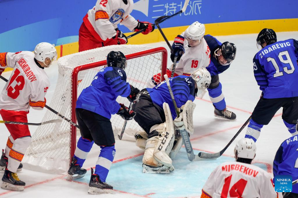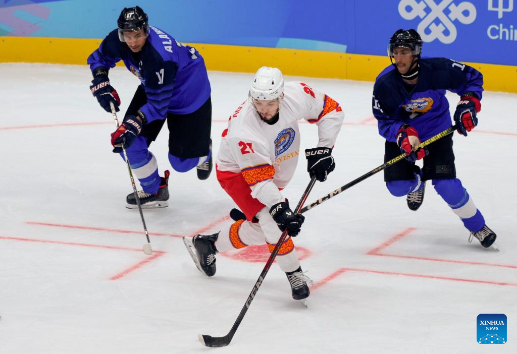 Mamed Seifulov (C) of Kyrgyzstan competes during the men's ice hocky group B match between Kuwait and Kyrgyzstan at 2025 Asian Winter Games in Harbin, northeast China's Heilongjiang Province, on Feb. 3, 2025. (Xinhua/Wang Jianwei)