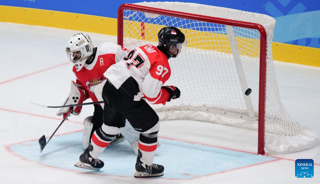 Chan Joshua Yu Wen (C) of Singapore shoots during the men's ice hocky group B match between Singapore and Bahrain at 2025 Asian Winter Games in Harbin, northeast China's Heilongjiang Province, on Feb. 3, 2025. (Xinhua/Wang Jianwei)