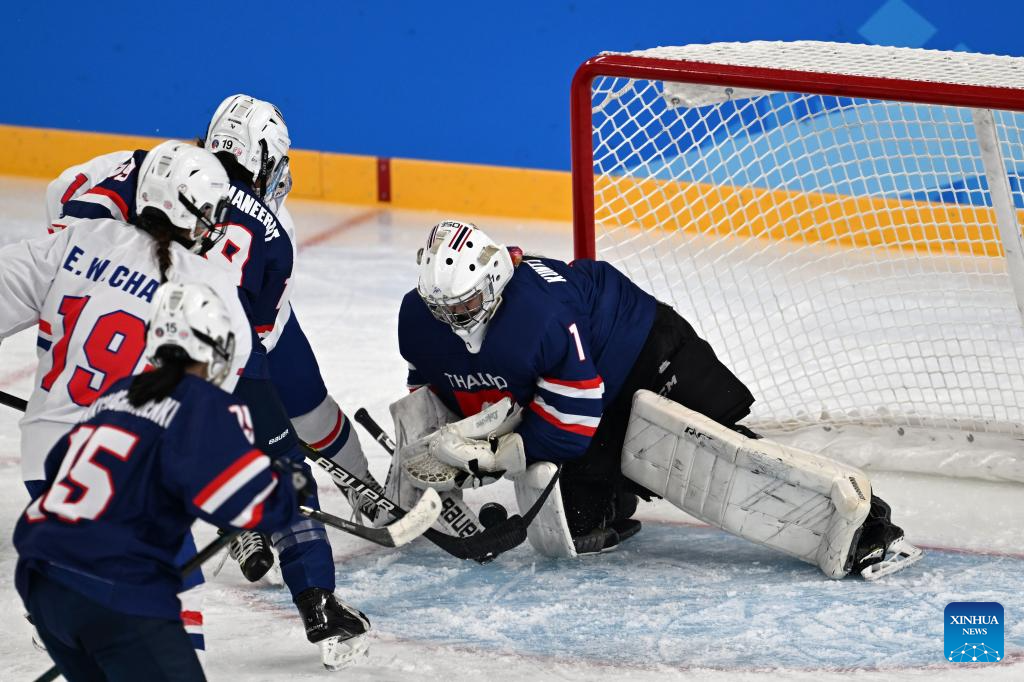 Thamida Kunthadapakorn (R) of Thailand blocks the puck during the women's ice hocky group B match between Thailand and Chinese Taipei at 2025 Asian Winter Games in Harbin, northeast China's Heilongjiang Province, on Feb. 3, 2025. (Xinhua/Chen Zhenhai)
