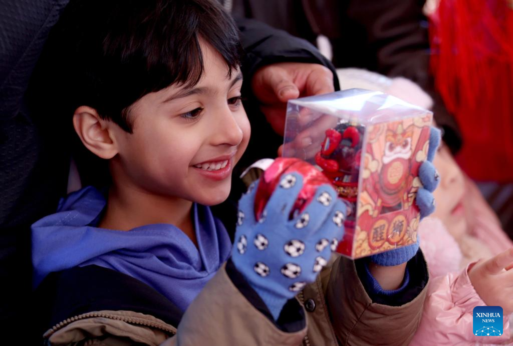 A boy holds a toy themed on the Chinese New Year in London, Britain, on Feb. 2, 2025. Various activities were held in London to celebrate the Chinese Year of the Snake on Sunday. (Xinhua/Li Ying)
