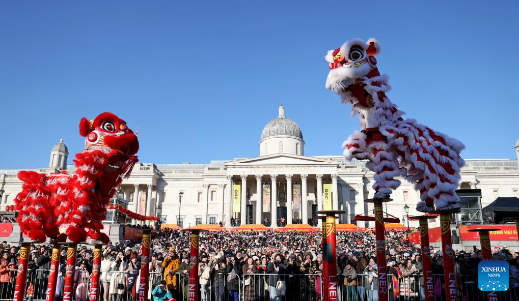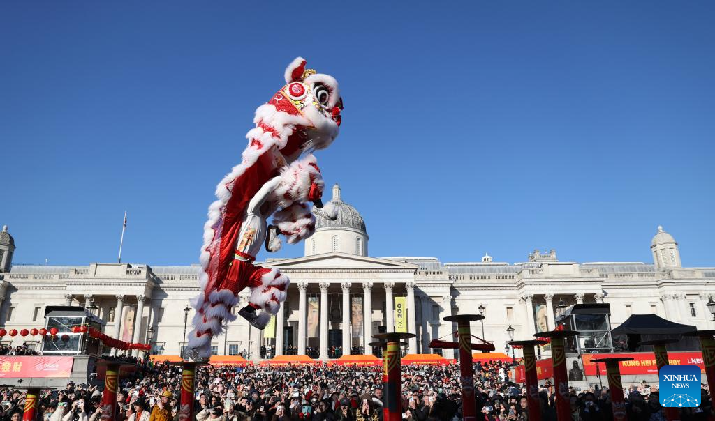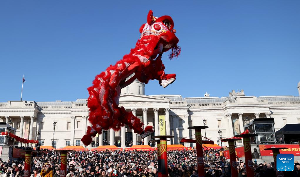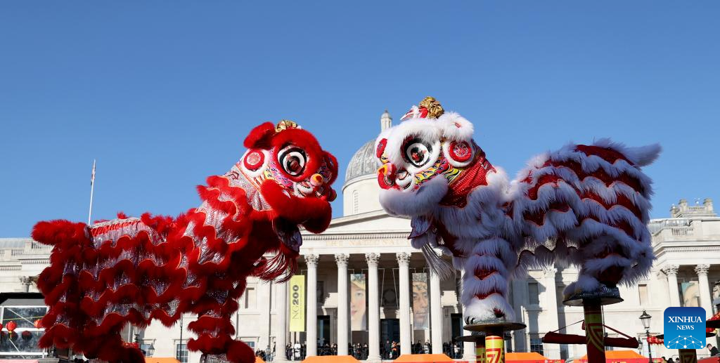 Lion dancers perform at Trafalgar Square to celebrate the Chinese New Year in London, Britain, on Feb. 2, 2025. Various activities were held in London to celebrate the Chinese Year of the Snake on Sunday. (Xinhua/Li Ying)