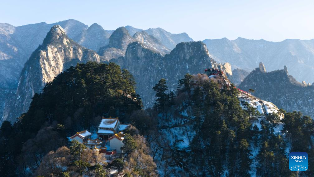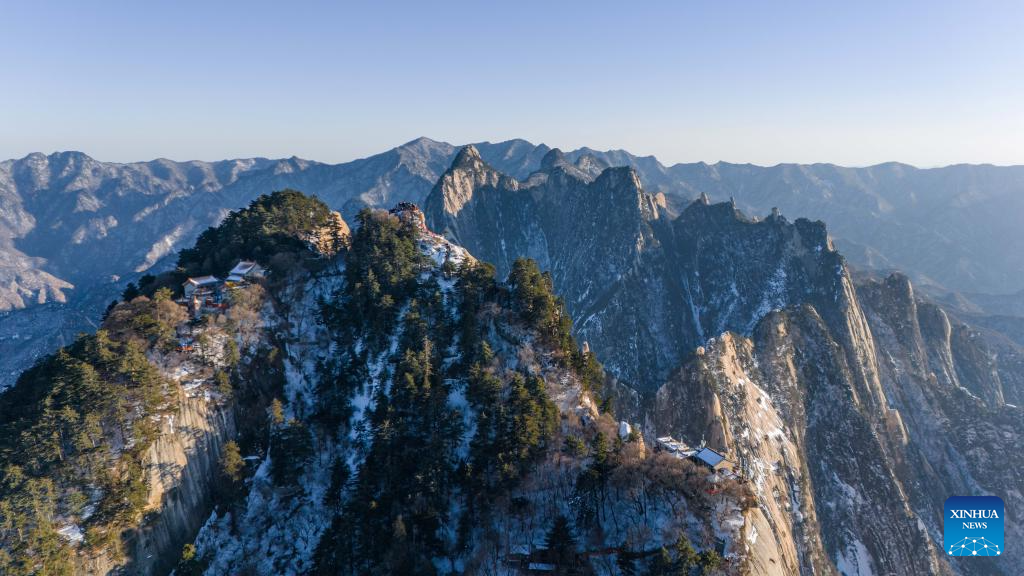 This aerial drone photo taken on Feb. 3, 2025 shows the scenery of Huashan Mountain in Weinan City, northwest China's Shaanxi Province. Huashan Mountain ushered in peak tourist season during the Spring Festival holiday with the average number of daily visitors exceeding 20,000. (Xinhua/Zou Jingyi)