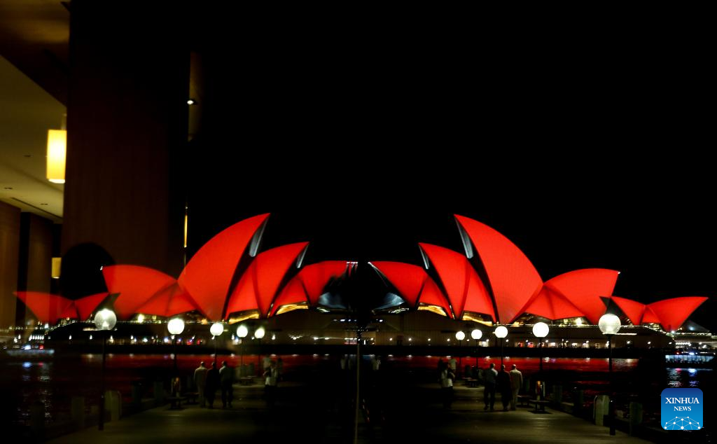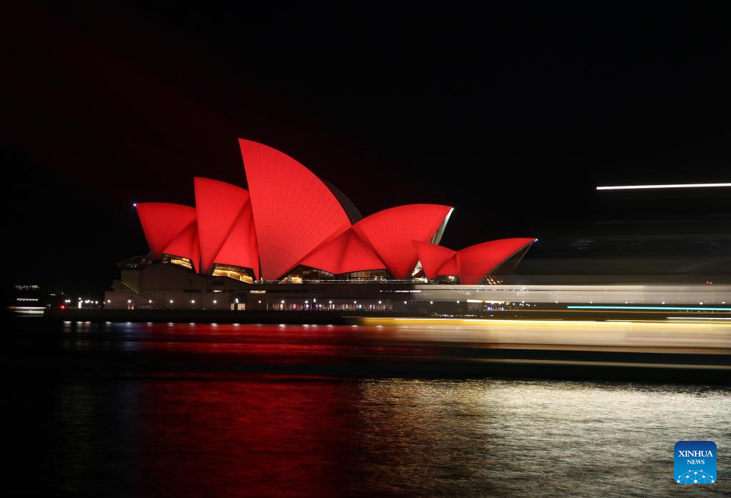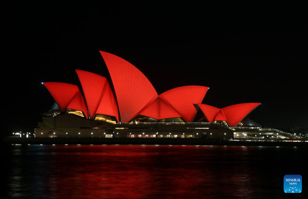 This photo taken on Feb. 4, 2025 shows the Opera House lit up in red to celebrate the Chinese New Year in Sydney, Australia. (Xinhua/Ma Ping)