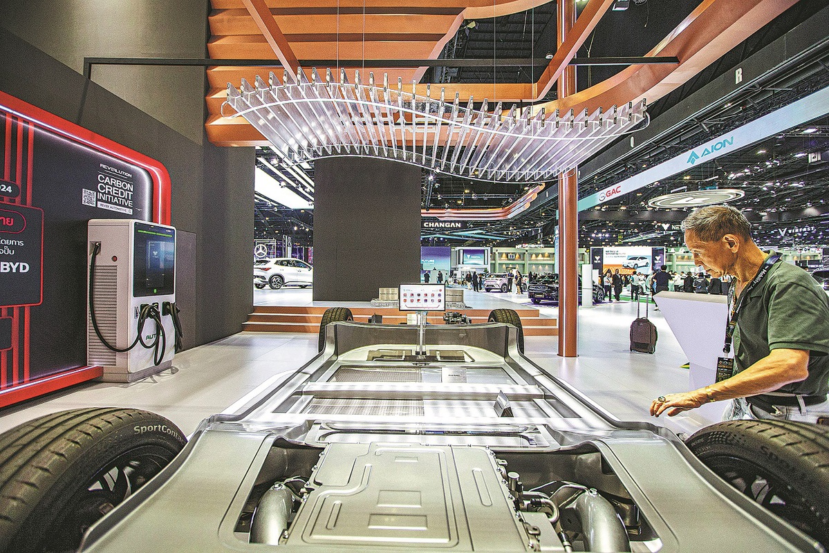 A visitor looks at a BYD e-Platform 3.0 during the 45th Bangkok International Motor Show in the capital of Thailand on March 27. (Wang Teng/Xinhua)