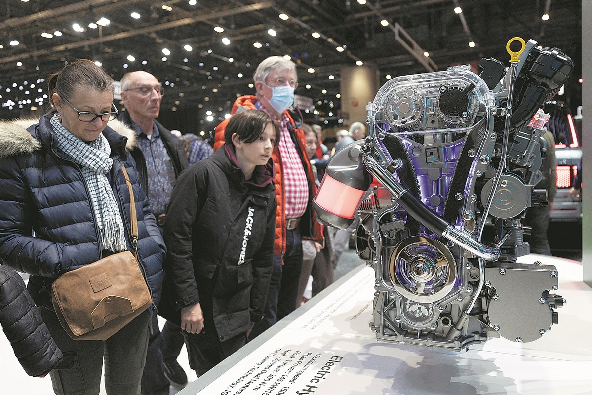 Visitors watch a new engine of BYD at the 91st Geneva International Motor Show in Geneva, Switzerland, on Feb 28, 2024. (Meng Dingbo/Xinhua)