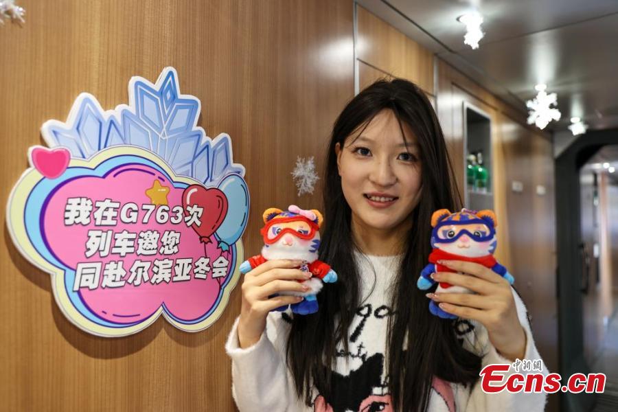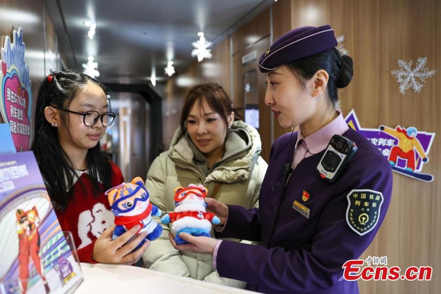 A train stewardess introduces the mascots of the 9th Asian Winter Games to passengers on high-speed train G763 from Panjin in northeast China's Liaoning Province to Harbin in Heilongjiang Province, Feb. 5, 2025. (China News Service/Yu Haiyang)