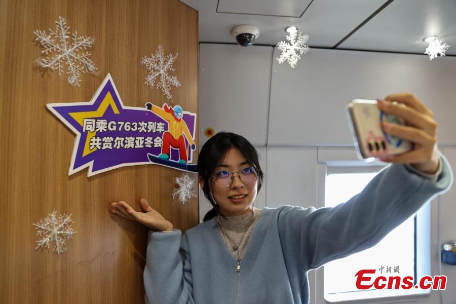 A passenger poses for a photo with decoration themed on 9th Asian Winter Games on high-speed train G763 from Panjin in northeast China's Liaoning Province to Harbin in Heilongjiang Province, Feb. 5, 2025. (China News Service/Yu Haiyang)