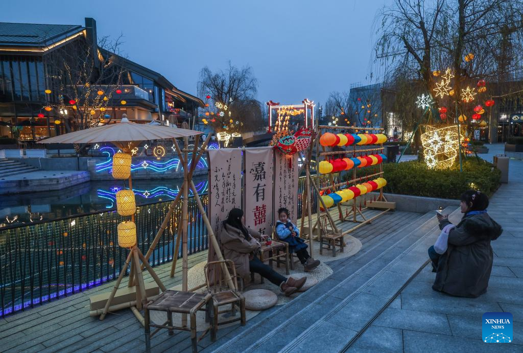 People pose for photos with festive decorations in Nanhu District of Jiaxing, east China's Zhejiang Province, Feb. 6, 2025. Festive preparations are underway in Nanhu District of Jiaxing for the upcoming Lantern Festival. (Xinhua/Xu Yu)