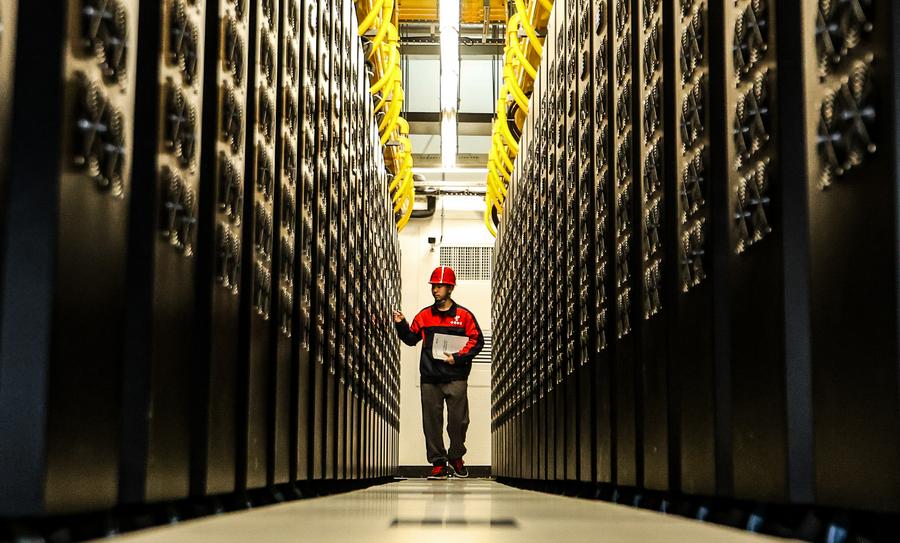 A staff member works in the data room of a supercomputing center in Gui'an New Area, southwest China's Guizhou Province, Aug. 29, 2024. (Xinhua/Liu Xu)
