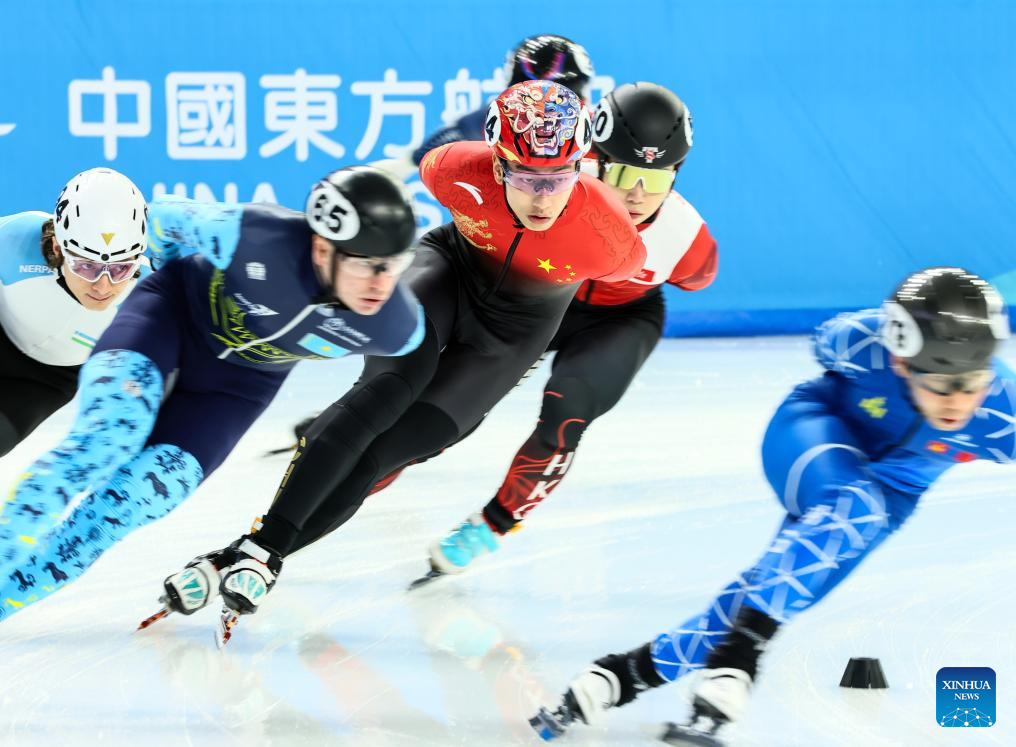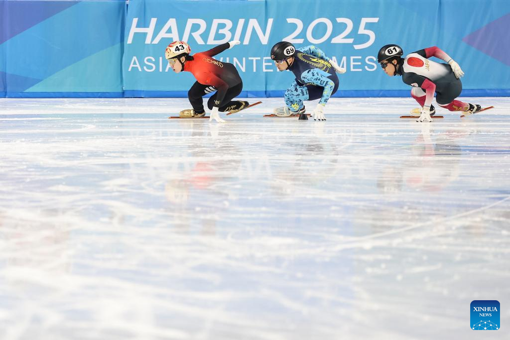 Lin Xiaojun (L) of China, Adil Galiakhmetov (C) of Kazakhstan and Ochi Daito of Japan compete during the men's 1500m quarterfinal match of the short track speed skating event at the 9th Asian Winter Games in Harbin, northeast China's Heilongjiang Province, Feb. 7, 2025. (Xinhua/Zhang Tao)