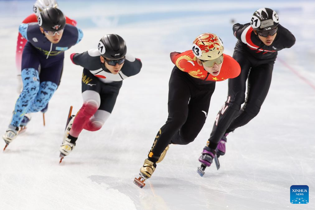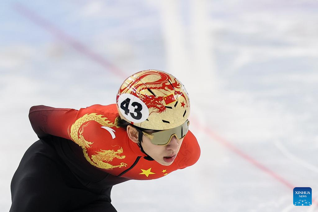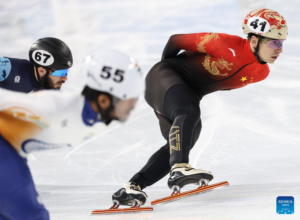 Lin Xiaojun of China competes during the men's 1500m quarterfinal match of the short track speed skating event at the 9th Asian Winter Games in Harbin, northeast China's Heilongjiang Province, Feb. 7, 2025. (Xinhua/Zhang Tao)