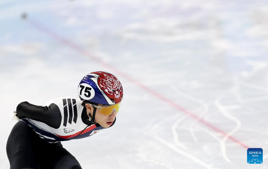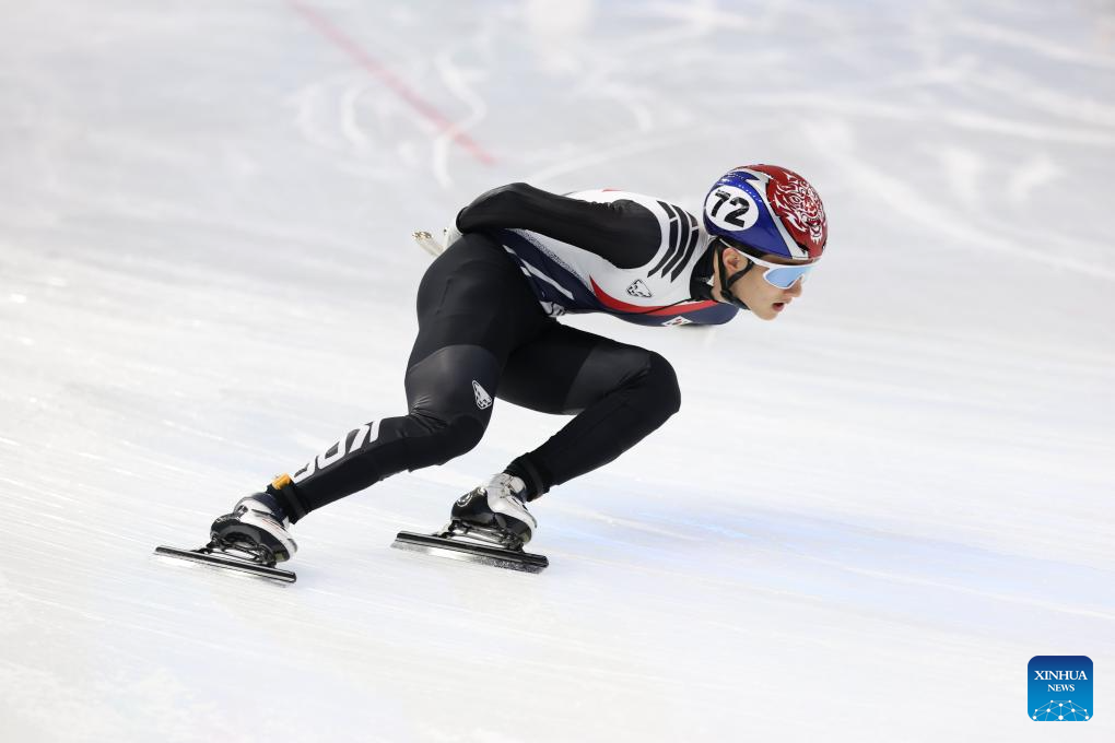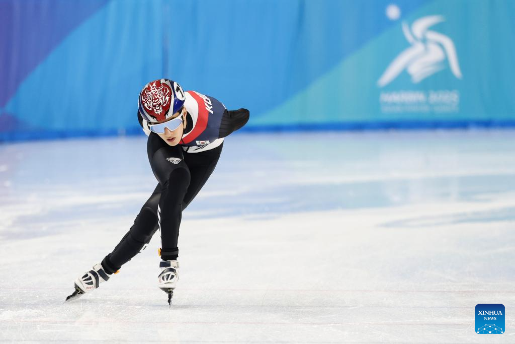 Kim Gunwoo of South Korea competes during the men's 1500m quarterfinal match of the short track speed skating event at the 9th Asian Winter Games in Harbin, northeast China's Heilongjiang Province, Feb. 7, 2025. (Xinhua/Zhang Tao)