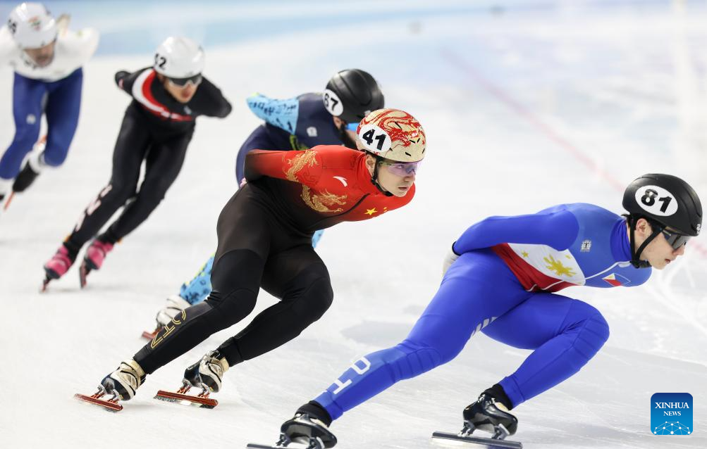 Peter Joseph Groseclose (1st R) of the Philippines and Liu Shaoang (2nd R) of China compete during the men's 1500m quarterfinal match of the short track speed skating event at the 9th Asian Winter Games in Harbin, northeast China's Heilongjiang Province, Feb. 7, 2025. (Xinhua/Zhang Tao)