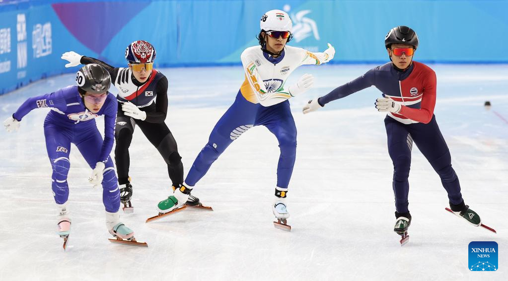 (from L to R) Tsai Chia-Wei of Chinese Taipei, Kim Gunwoo of South Korea, Eklavya Jagal of India and Chirawat Phonkat of Thailand compete during the men's 1500m quarterfinal match of the short track speed skating event at the 9th Asian Winter Games in Harbin, northeast China's Heilongjiang Province, Feb. 7, 2025. (Xinhua/Zhang Tao)