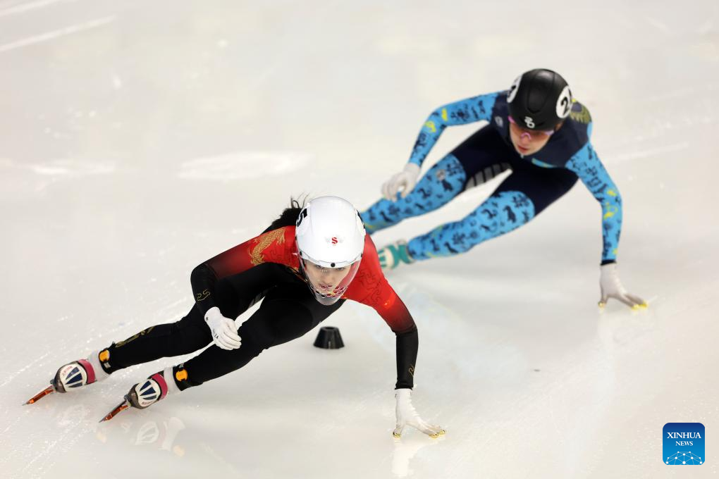 Wang Xinran (L) of China competes during the mixed 2000m relay semifinal match of the short track speed skating event at the 9th Asian Winter Games in Harbin, northeast China's Heilongjiang Province, Feb. 7, 2025. (Xinhua/Ding Xu)