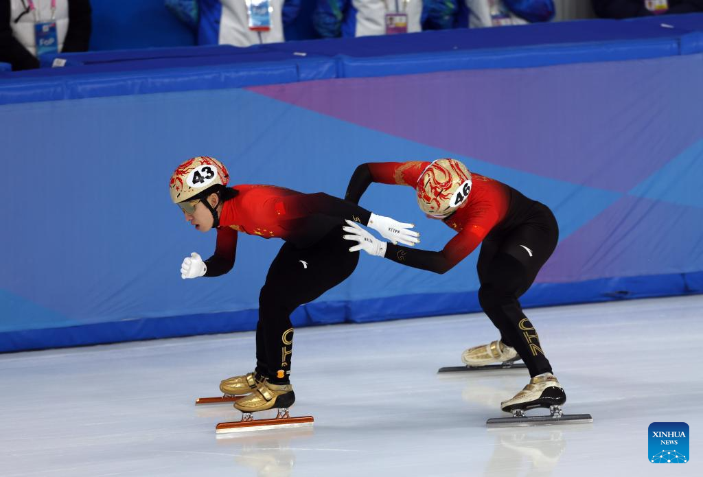 Liu Shaolin (R) and Lin Xiaojun of China compete during the mixed 2000m relay semifinal match of the short track speed skating event at the 9th Asian Winter Games in Harbin, northeast China's Heilongjiang Province, Feb. 7, 2025. (Xinhua/Ding Xu)