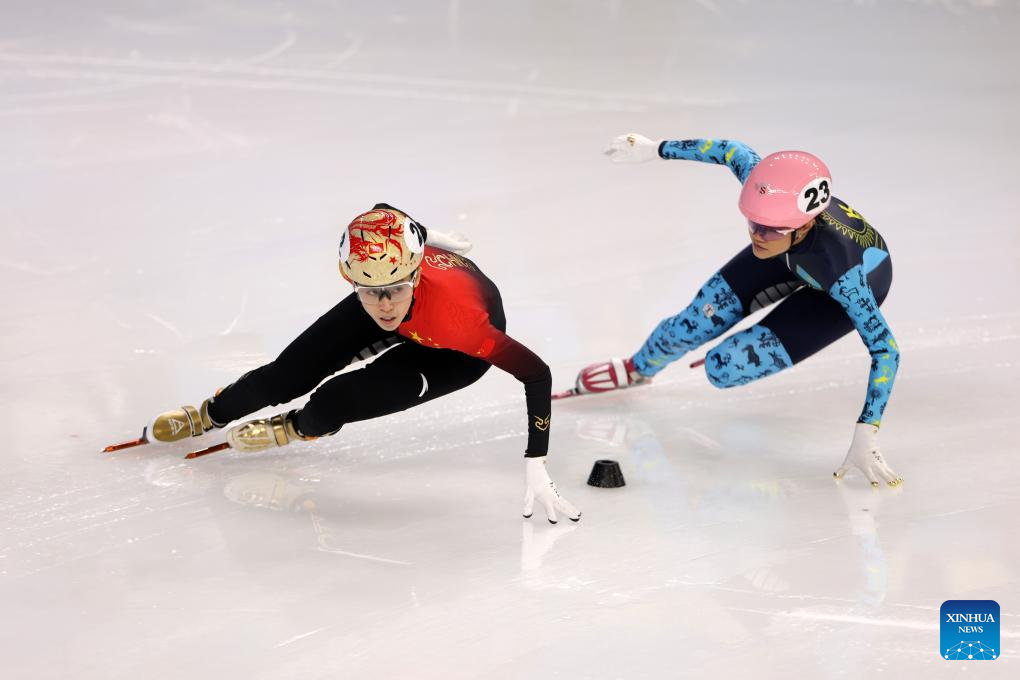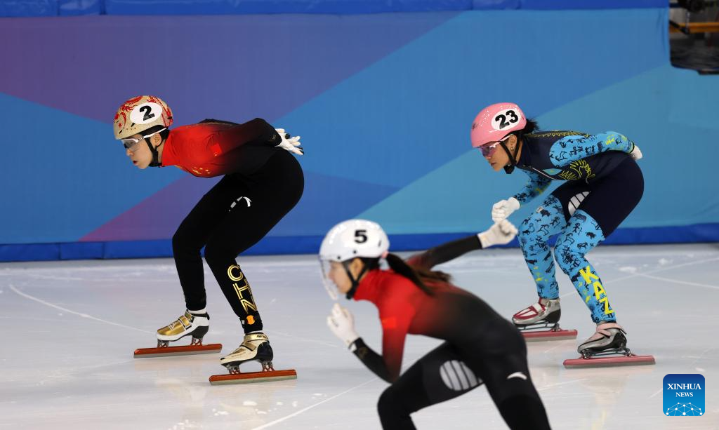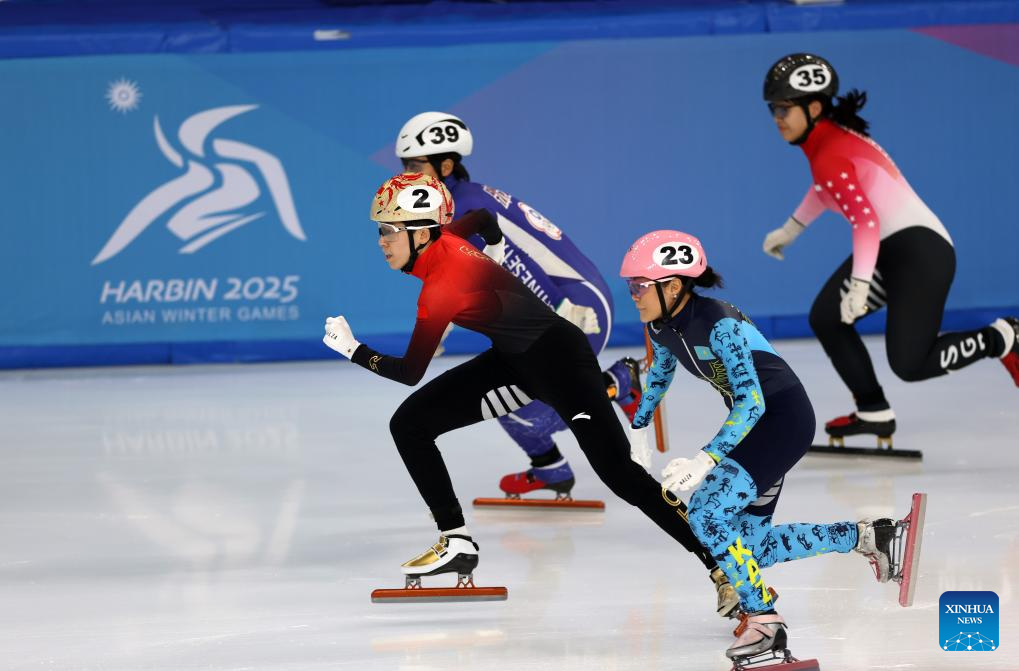 Fan Kexin (1st L) of China competes during the mixed 2000m relay semifinal match of the short track speed skating event at the 9th Asian Winter Games in Harbin, northeast China's Heilongjiang Province, Feb. 7, 2025. (Xinhua/Ding Xu)
