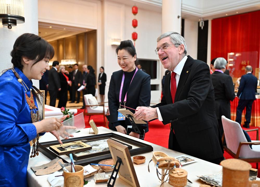 International Olympic Committee President Thomas Bach experiences intangible cultural heritage items before a welcome banquet in Harbin, northeast China's Heilongjiang Province, Feb. 7, 2025. Chinese President Xi Jinping and his wife, Peng Liyuan, on Friday hosted a welcome banquet in China's northeastern city of Harbin for international dignitaries who are here to attend the opening ceremony of the 9th Asian Winter Games.