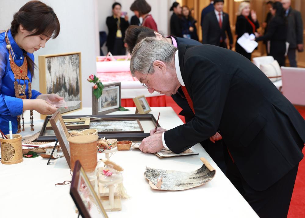 Before the banquet, the guests toured a display showcasing Heilongjiang's intangible cultural heritage. (Xinhua/Yan Yan)